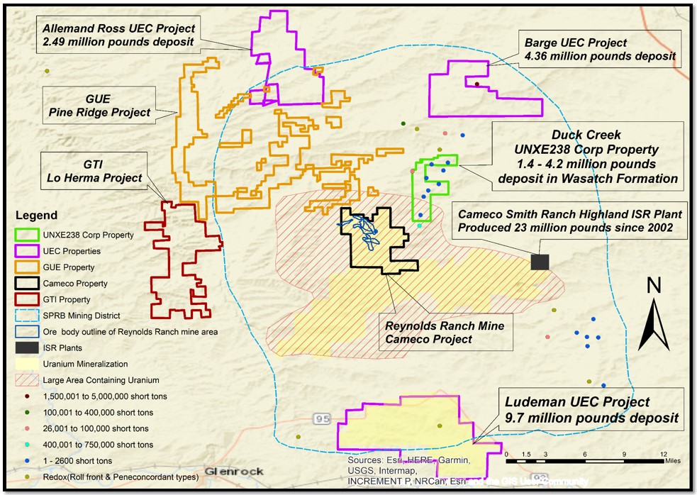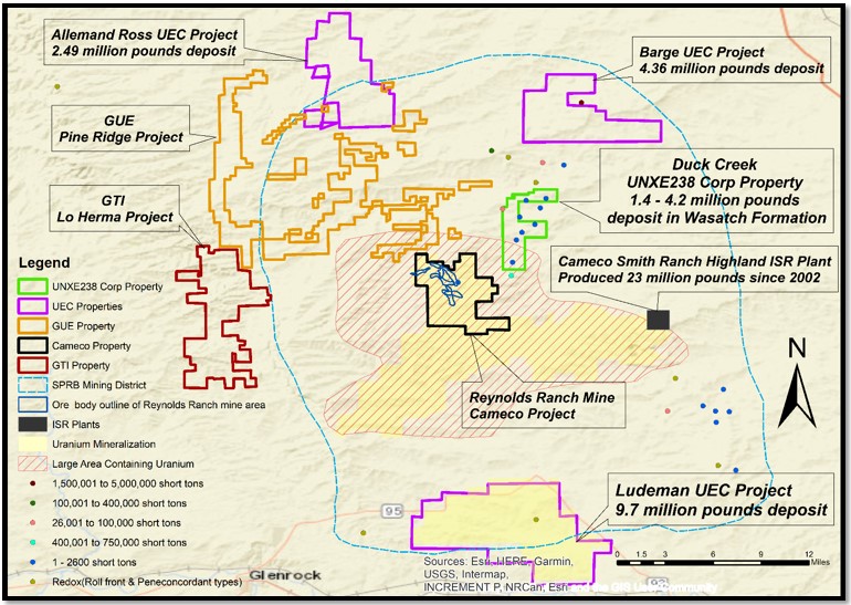 The project is about 5 miles, 7.5 miles and 12 miles south, southeast and north of Barge, Allemand Ross and Ludeman projects of UEC, respectively. The project is about 1 mile northeast of Smith –Reynold Ranch deposits.