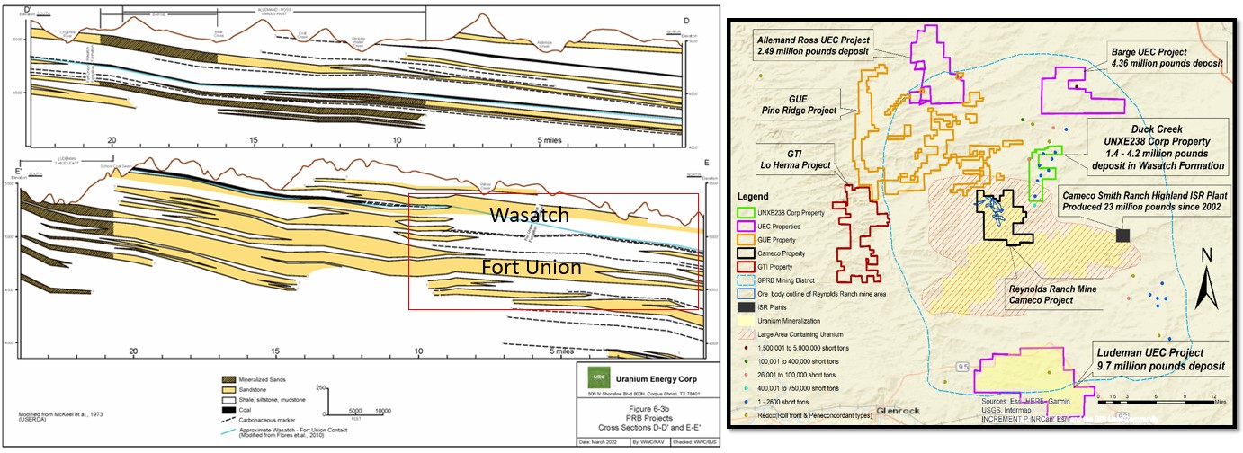 The real potential is the highly mineralized Fort Union Formation at 600-1000 ft underneath Duck Creek project. This is very likely as the same sandstone have mineralization under Reynolds Ranch a mile to the west and the same sandstone extends underneath Duck Creek